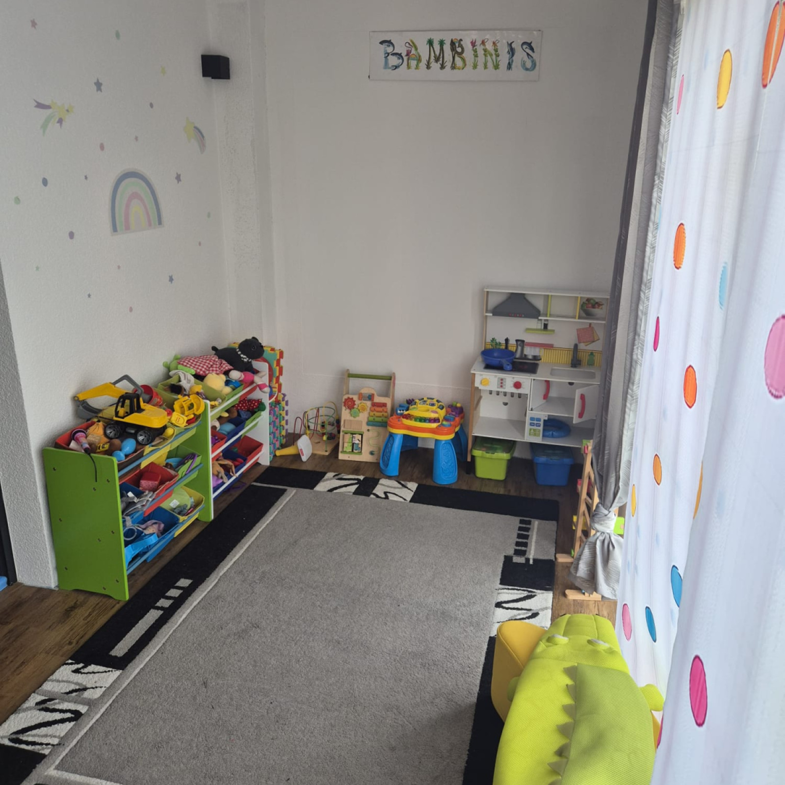 Für den Mittagsschlaf oder um sich auszuruhen gibt es den Schlafbereich mit einer eigenen Matratze für jedes Kind. Die Küche ist besonders wichtig: hier bereiten wir – auch oft gemeinsam mit den Kindern – die Mahlzeiten zu und lassen es uns zusammen am kleinen Tisch schmecken. In den Räumen gibt es verschiedene Bereiche zum Basteln oder Spielen – mache Bereiche werden auch für verschiedene Anlässe umgeräumt.